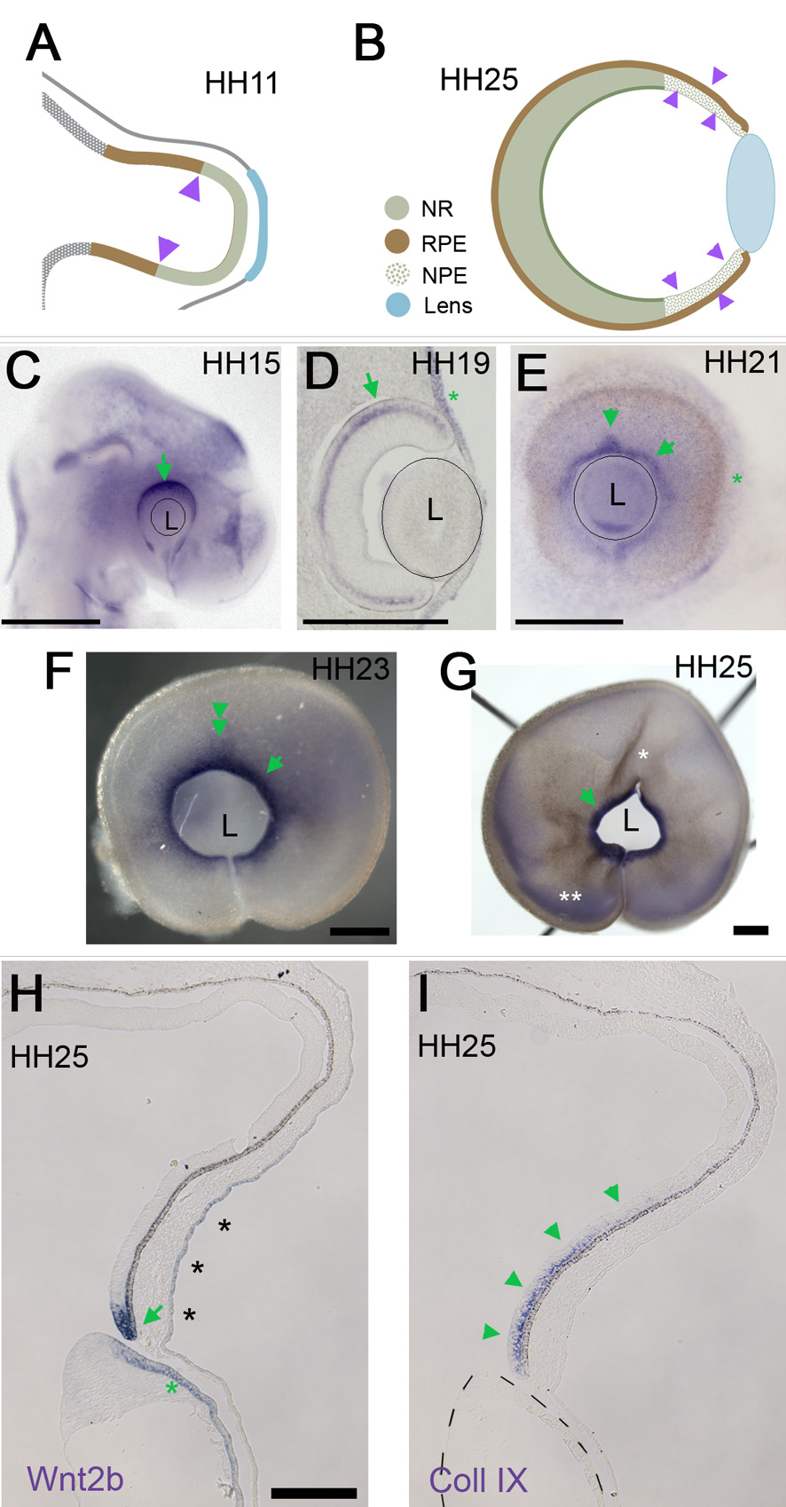 Wnt2b. I: Adjacent section stained for collagen IX shows the extent of specified ciliary body tissue (green arrowheads) in the anterior
