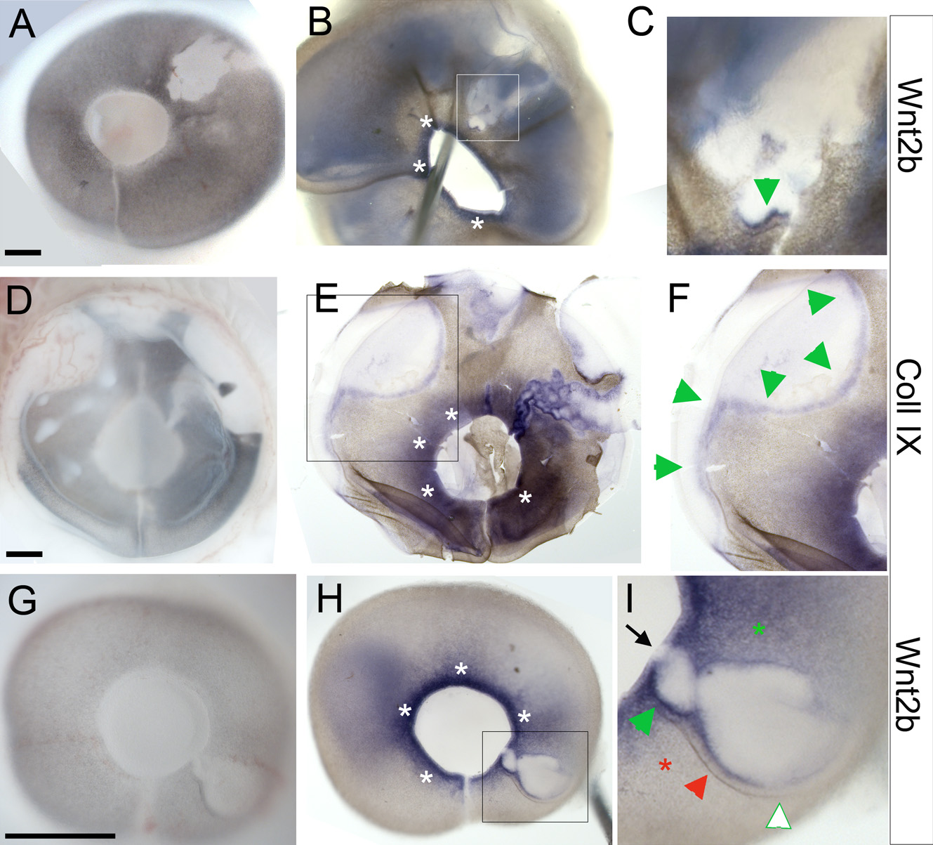 in unaffected anterior optic cup lip tissue. The boxed area is magnified in F. F: CollagenIX is ectopically expressed throughout the borders of the infected patch (green arrows). G, H: An infected eye at HH stage 23 before (G) and after (H) in situ hybridization to localize Wnt2b expression. The asterisks indicate endogenous expression, and the boxed area is
