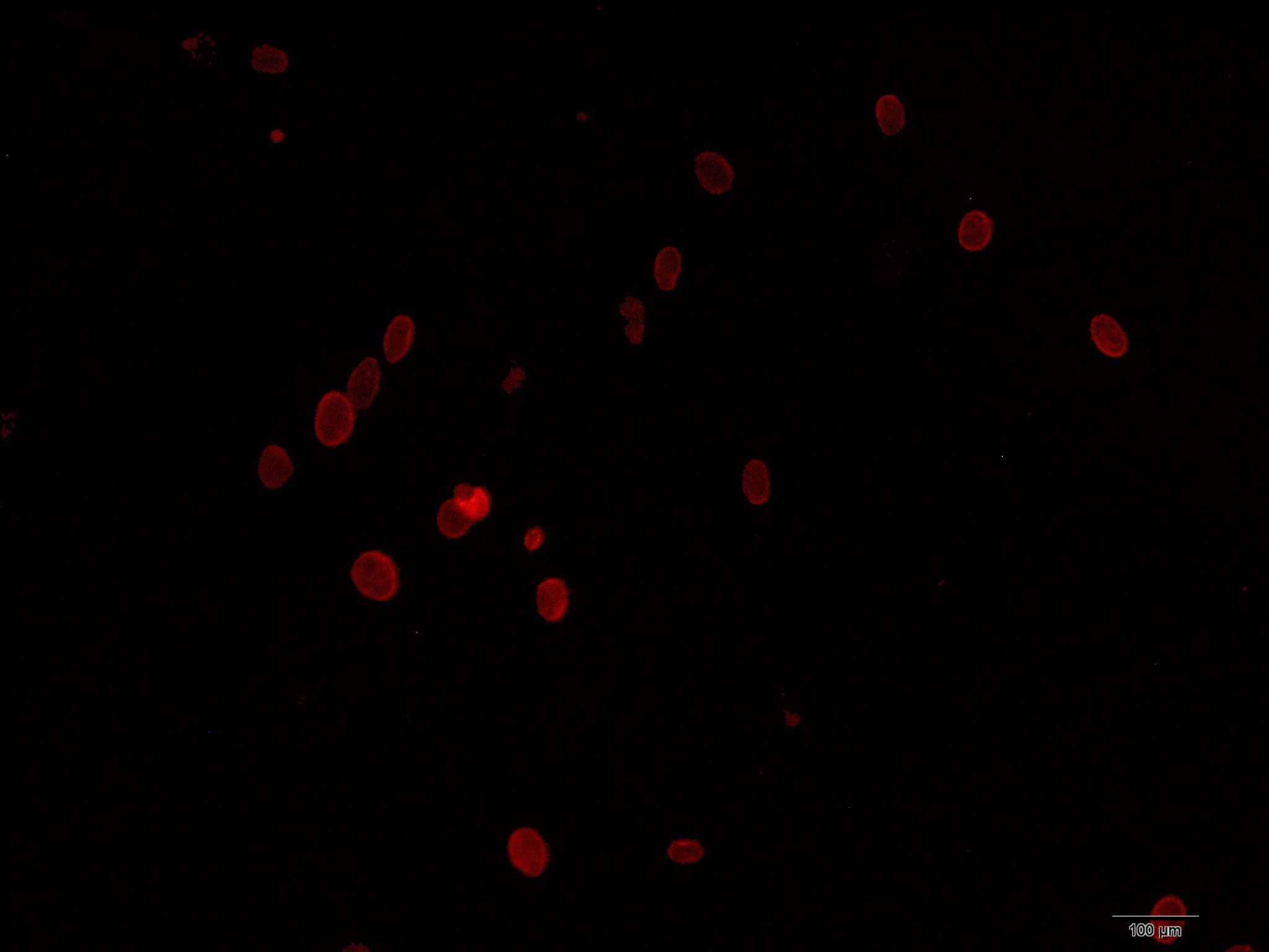 Immunofluorescence staining of 63-kDa protein in primary culture of mouse limbal epithelial cells. The 63-kDa protein positive cells (red) indicated the presence of the limbal epithelial progenitor cells.