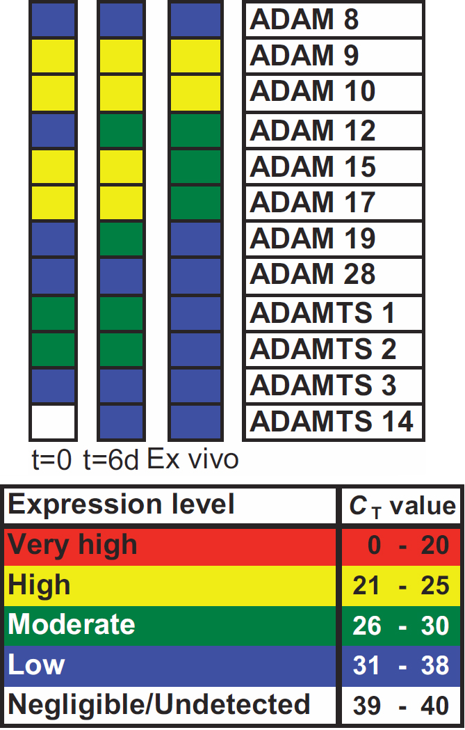 Figure 3. ADAM/ADAMTS gene expression in response to mechanical trauma. Gene expression profiles were classified in CBs; at t=0 following in vitro