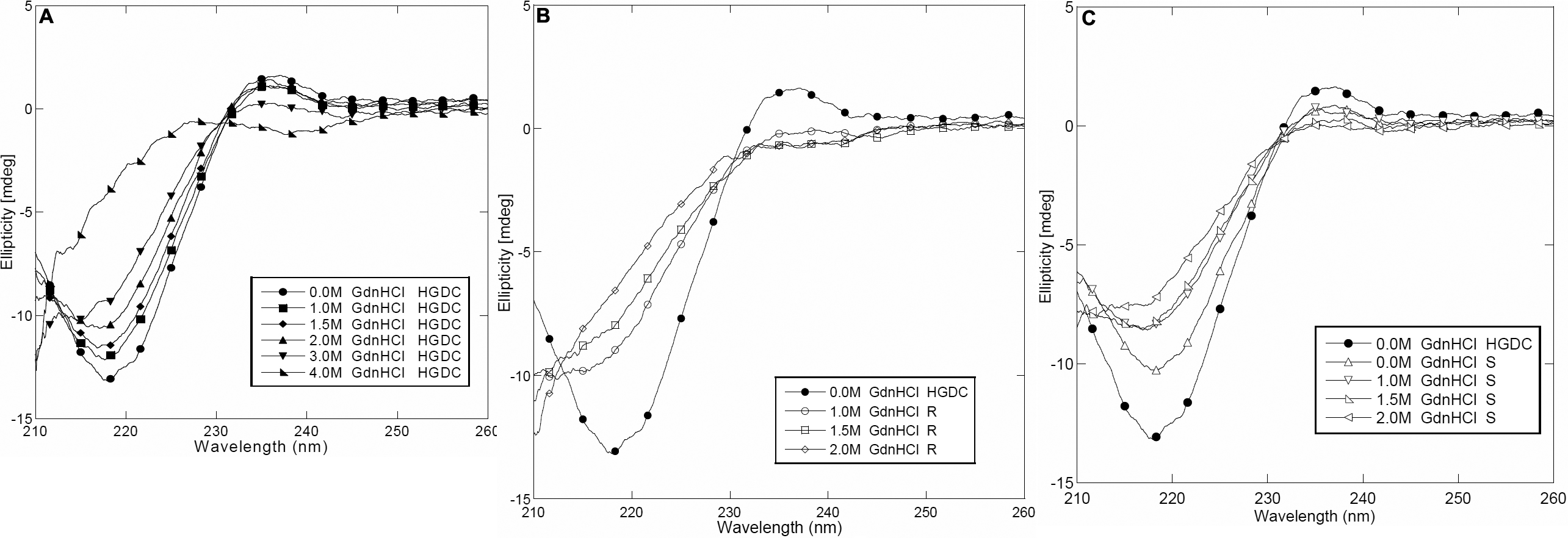 Representative far-UV CD spectra of HGDC samples with various concentrations of GdnHCl.