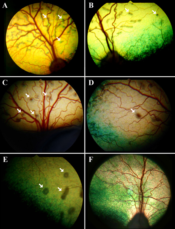 Figure 1. Multifocal retinal dysplasia and canine multifocal retinopathy (cmr) fundus phenotypes. Fundus appearance associated with multifocal retinal dysplasia (MRD; A, B) compared to canine multifocal retinopathy 3 (cmr3; C, D), canine multifocal retinopathy 1 (cmr1; E), and a normal reference fundus (F). A-B: MRD: retinal folds with hyporeflective areas. Smaller lesions (arrows) can appear similar to cmr, particularly in dogs that have only one or few folds. C-D:cmr3: Multiple brown-gray oval lesions located subretinally (C, arrows) that generally are of smaller diameter than the optic disc. Lesions are elevated and are surrounded by a “halo”