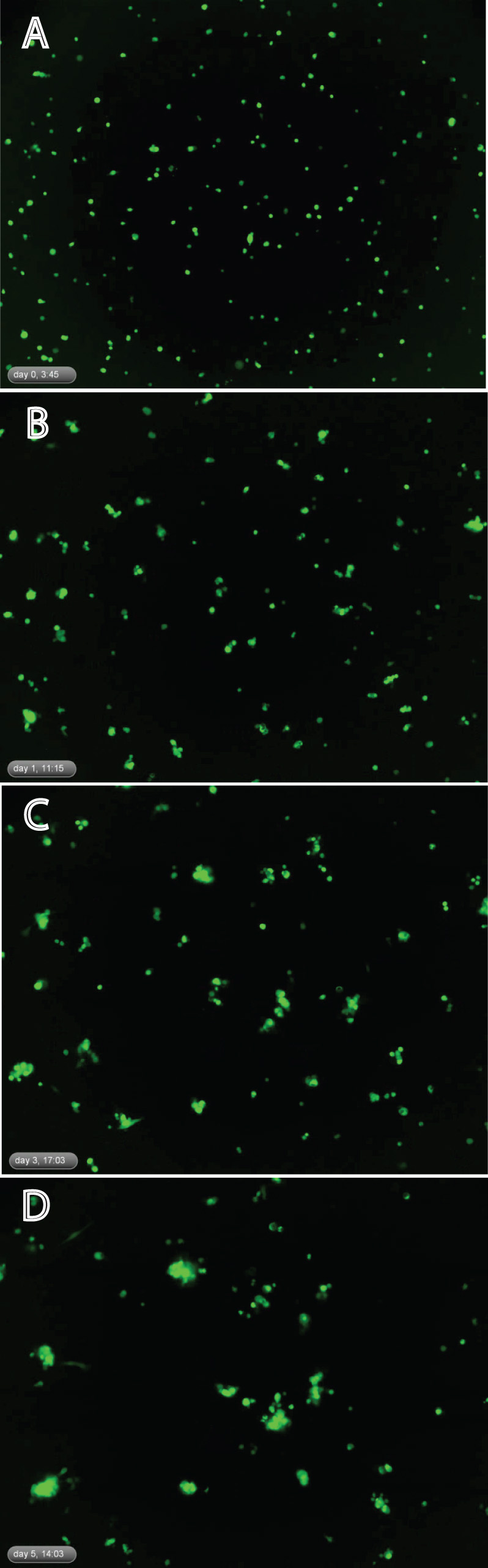 Figure 3. Still frames taken at the following time points in culture: A. Day 0, 3:45 h; B. Day 1, 11:15 h; C. Day 3, 17:03 h; D. Day 5, 14:03 h. These images highlight the basic findings of the time-lapse experiment, namely, the simultaneous enlargement