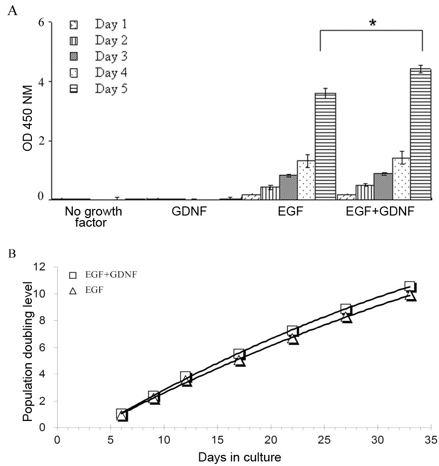 with the addition of GDNF to the medium conferring a statistically significant advantage over EGF alone at day 5. This effect