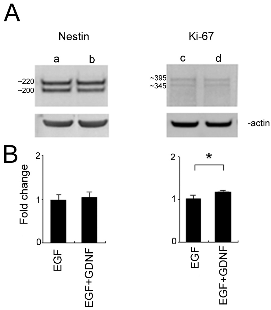 i-67 in EGF+GDNF. β-actin was used as the loading control (lower panels). B: Quantitative analysis showed no significant difference