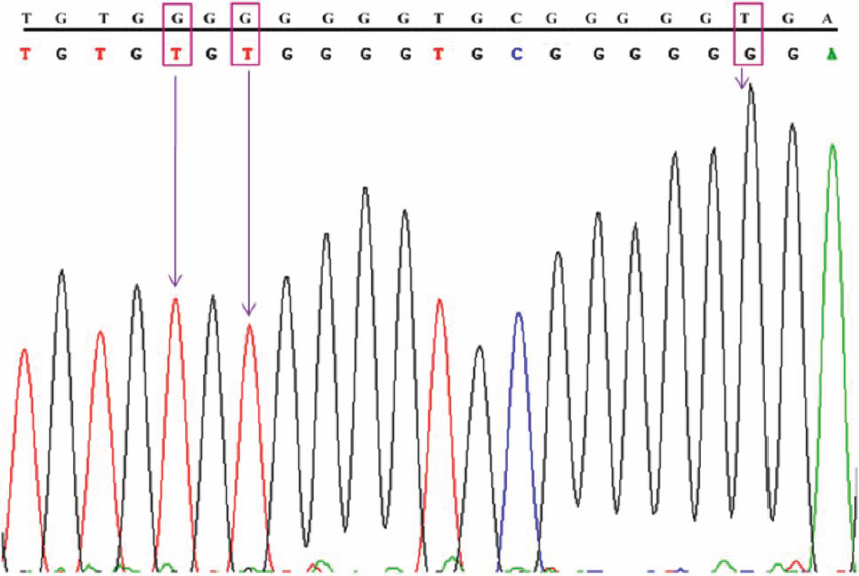 Figure 7. Chromatogram representing the g.1284G>T, g.1286G>T, and g.1299T>G polymorphisms from Intron-1 of MYOC. Top line: wild type sequence. Bottom line: observed sequence. The arrow indicates the position of sequence variation. Box