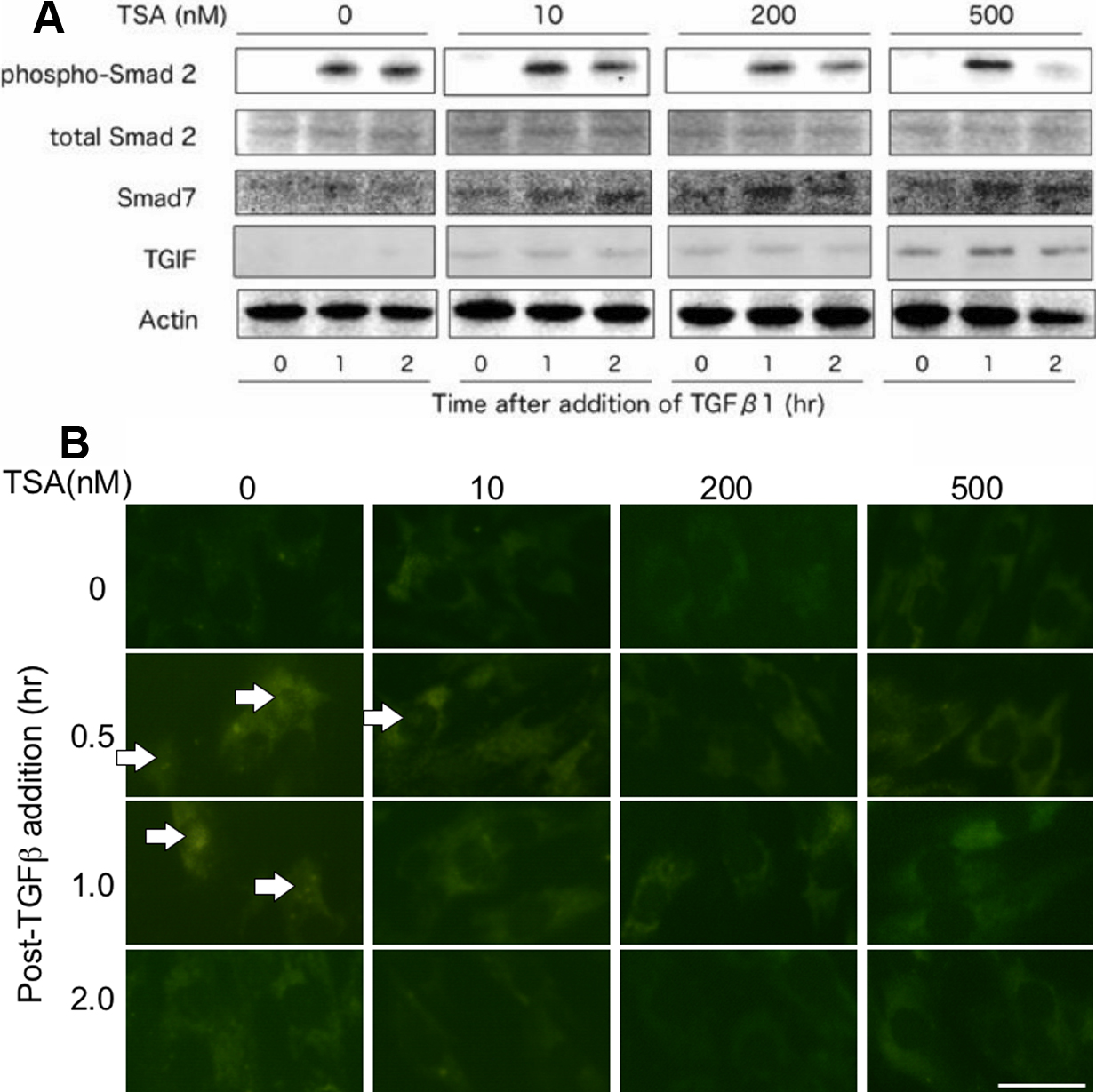 its phosphorylation level at 2 h. Adding TSA upregulated the expression of Smad7 and TGIF in a dose-dependent manner. B: Immunocytochemistry also showed that TSA suppressed nuclear translocation of pSmad2. In the absence of TSA pSmad2 was detected