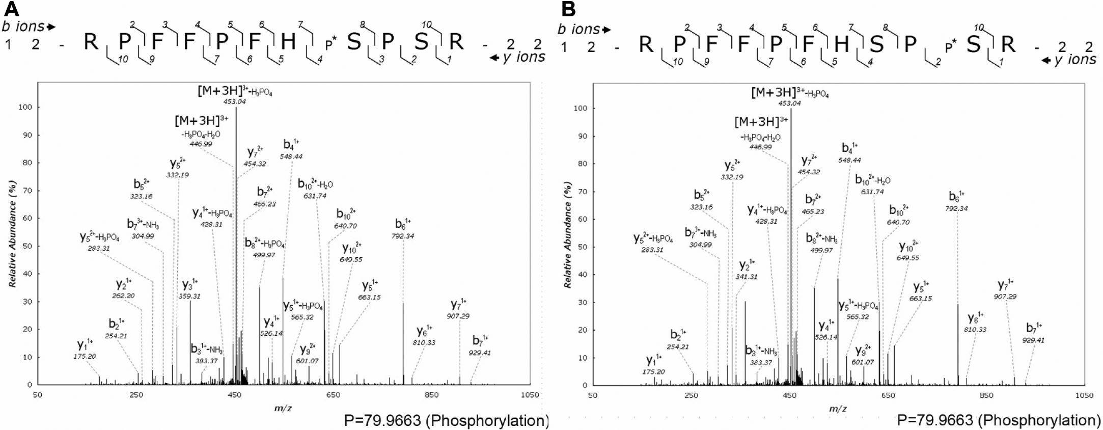spectra of the phosphorylated peptides 12RPFFPFHS*PSR22