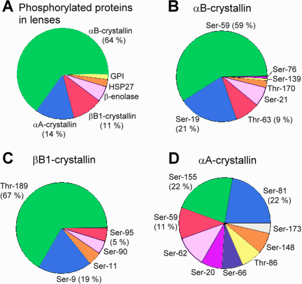 A: Proportion of the proteins with phosphorylation in total lens extract. B: Distribution of in vivo phosphorylation sites in αB-crystallin. C: Distribution of in vivo phosphorylation sites in βB1-crystallin. D: Distribution of in vivo phosphorylation sites in αA-crystallin. The three most abundantly phosphorylated proteins (%) in