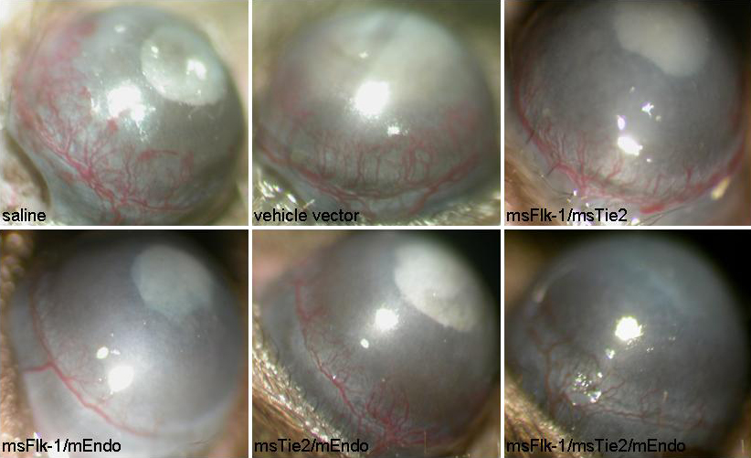 NV). Zones of inhibition of neovascularization were visible in corneas injected with retroviral virus expressing mEndo, msFlk-1,
