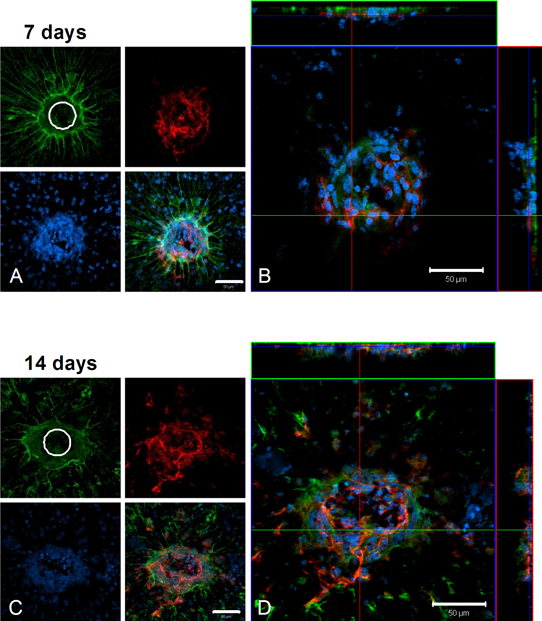 blue), and endothelial cells (isolectin B4, red) are shown on the left,