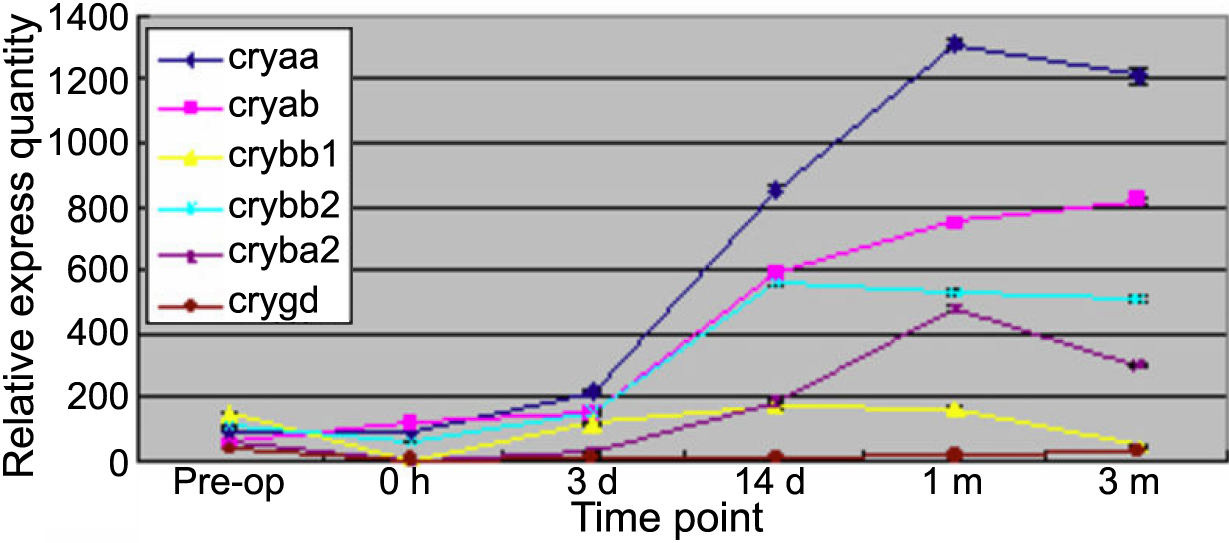 . The lens tissue is dissected at pre-operation, 0 h, 3 days, 7 days, 14 days, 1 month, and 3 months after ECLE and is then assayed.