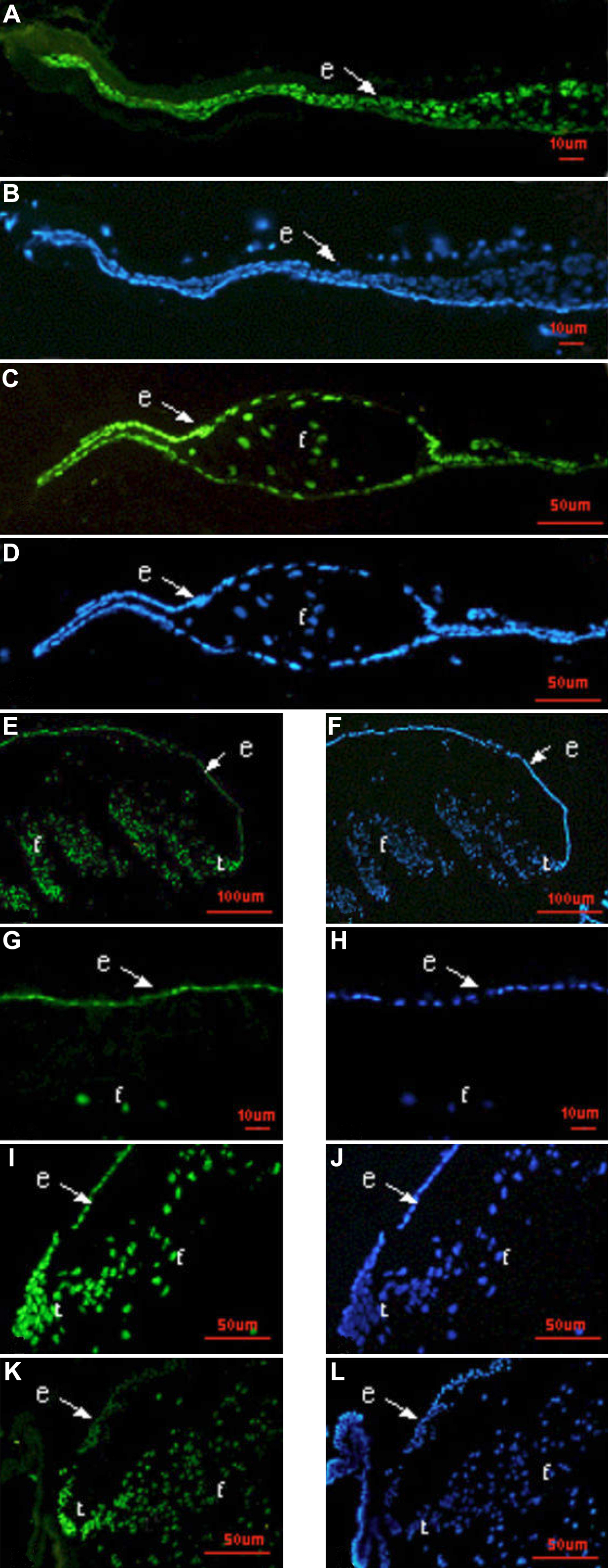 L). Abbreviations: e, lens epithelium; f, lens fiber cells; t,