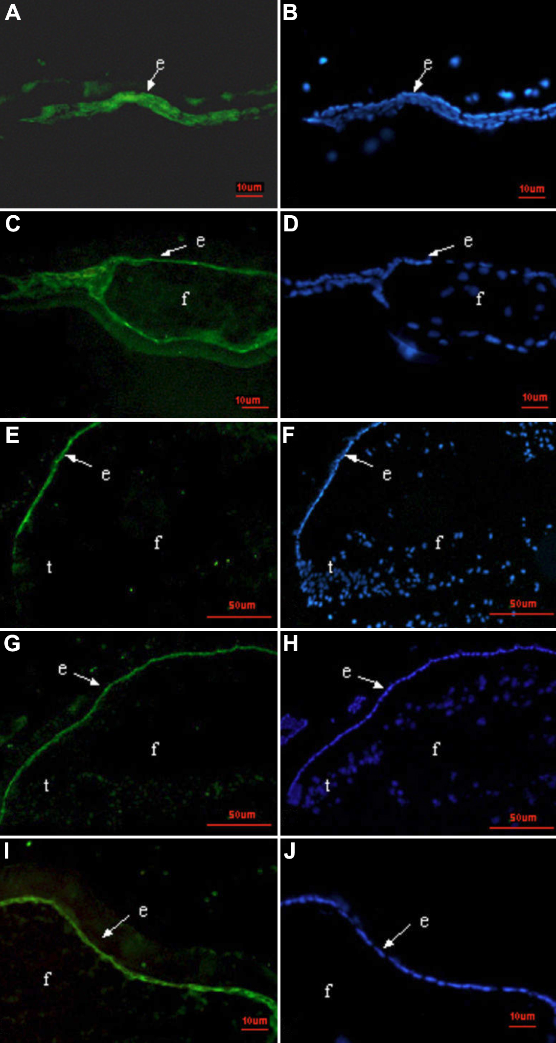 it is in normal lens development. Note that the anterior capsule adheres to the posterior capsule on day 3 (A, B), no Foxe3 positive stain is found in the differentiating fibers at day7(C, D), and Foxe3 is strictly located in the lens epithelium on day14 (E, F) and 1 month after ECLE (G, H; I, J). Abbreviations: e, lens epithelium; f, lens fiber cells; t, transition zone.