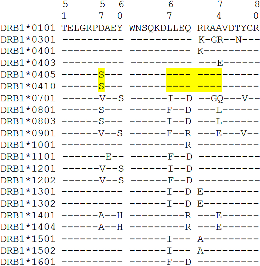 included in the figure, the following rare alleles were also observed in this study: HLA-DRB1*0305, HLA-DRB1*0407, HLA-DRB1*0804, HLA-DRB1*1106, HLA-DRB1*1111, HLA-DRB1*1415, HLA-DRB1*1506, HLA-DRB1*1507, HLA-DRB1*1509, HLA-DRB1*1514, and HLA-DRB1*1602. Amino acid sequences are shown using the one-letter code. The epitope S57–LLEQRRAA (67–74) is highlighted.