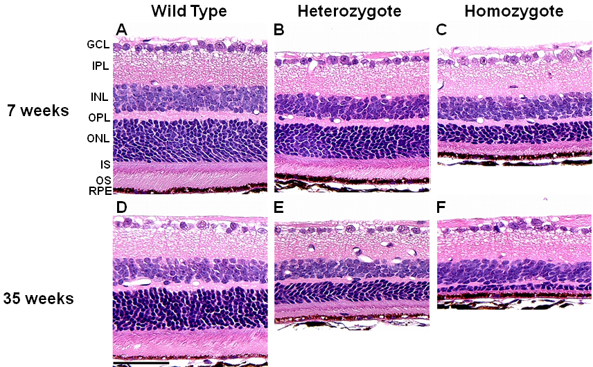 Figure 4. Photomicrographs of retinas from 7- (A, B, C) and 35- (D, E, F) week-old Rom1+/+, Rom1Rgsc1156/+, and Rom1Rgsc1156/Rgsc1156 mice (n=3 or 4 each). The outer nuclear layer of the heterozygotes (B, E) was thinner and the photoreceptor outer segments were shorter than in wild-type mice (A, D). The alterations were even greater in the homozygotes (C, F). Differences were more marked at 35 weeks of age than at 7 weeks of age. GCL, IPL, INL, OPL, ONL, IS, OS, and RPE correspond