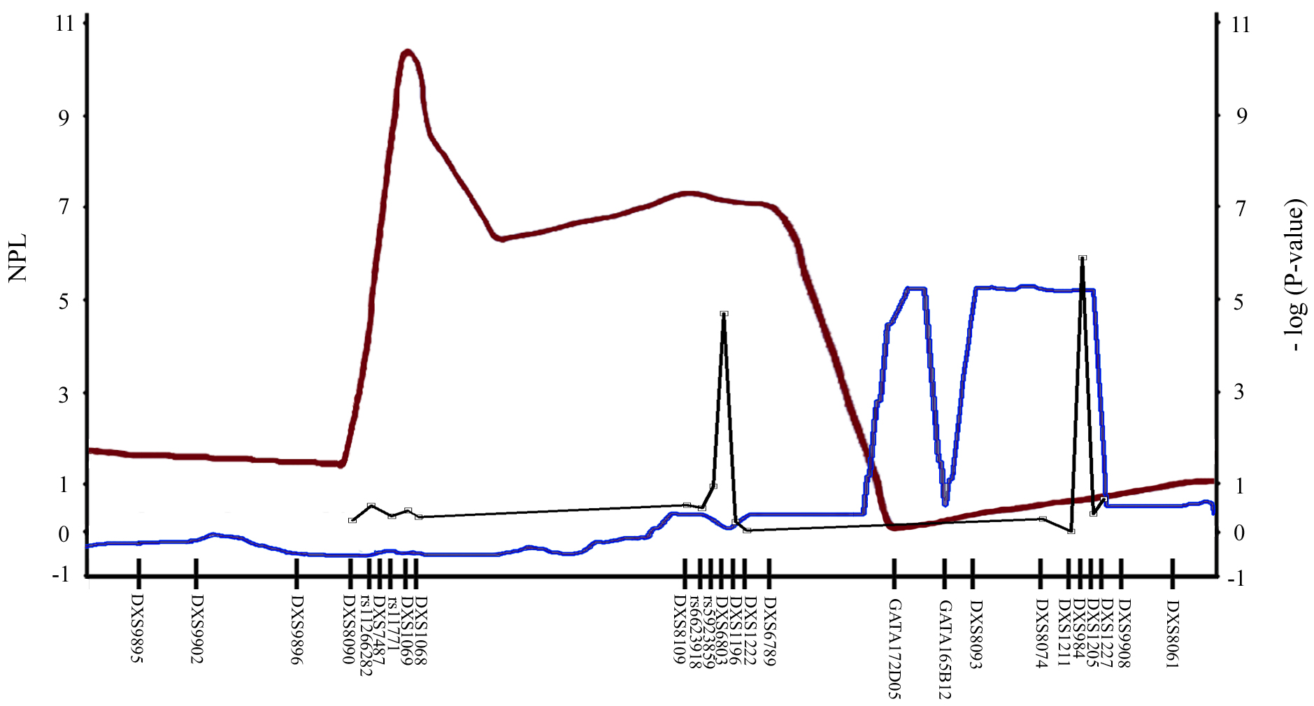 for LHON on the X-chromosome. Auburn and blue lines show the results of