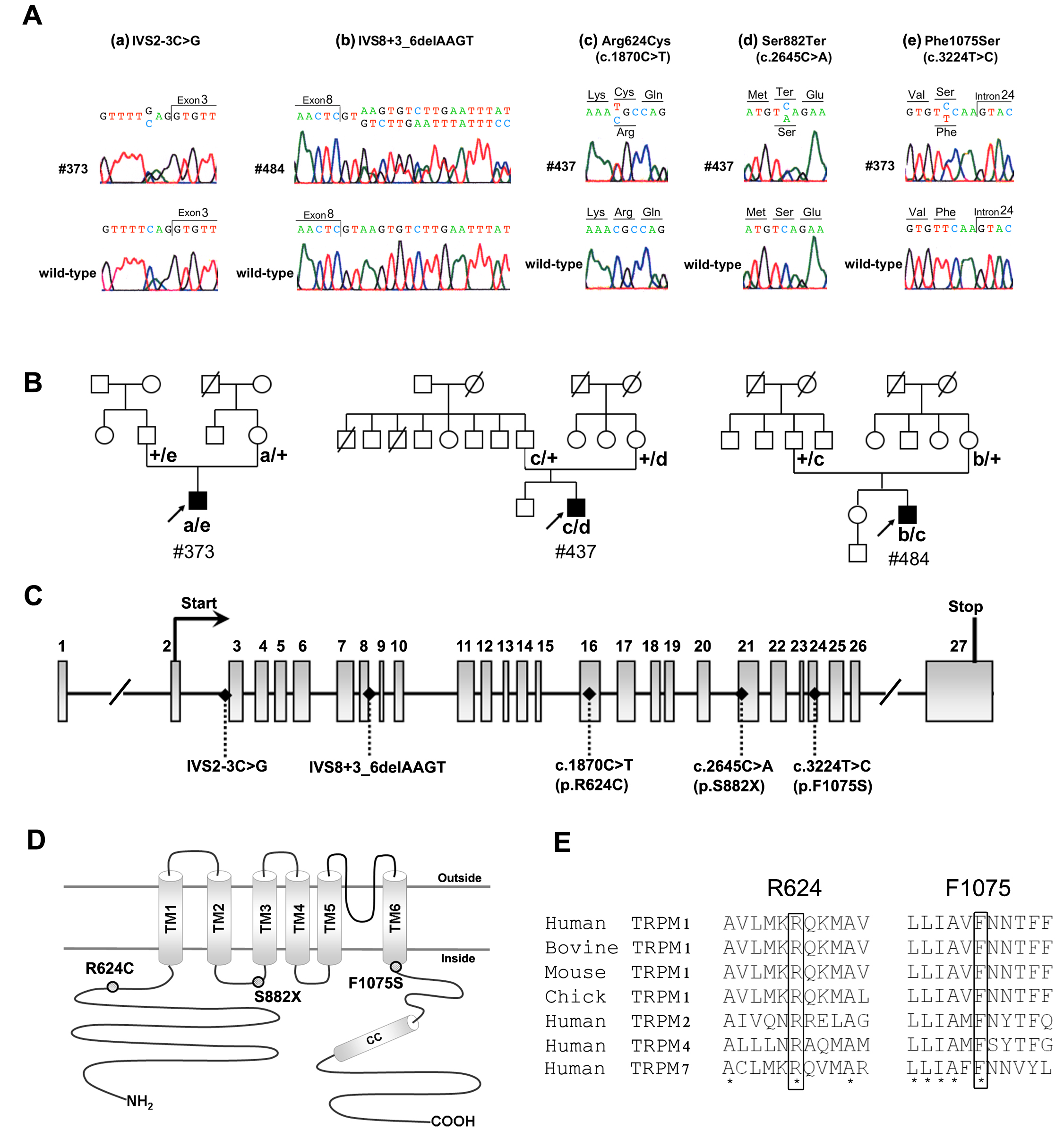 patient #437 (d), and Phe1075Ser (c. 3224T>C) in patient #373(e). B: