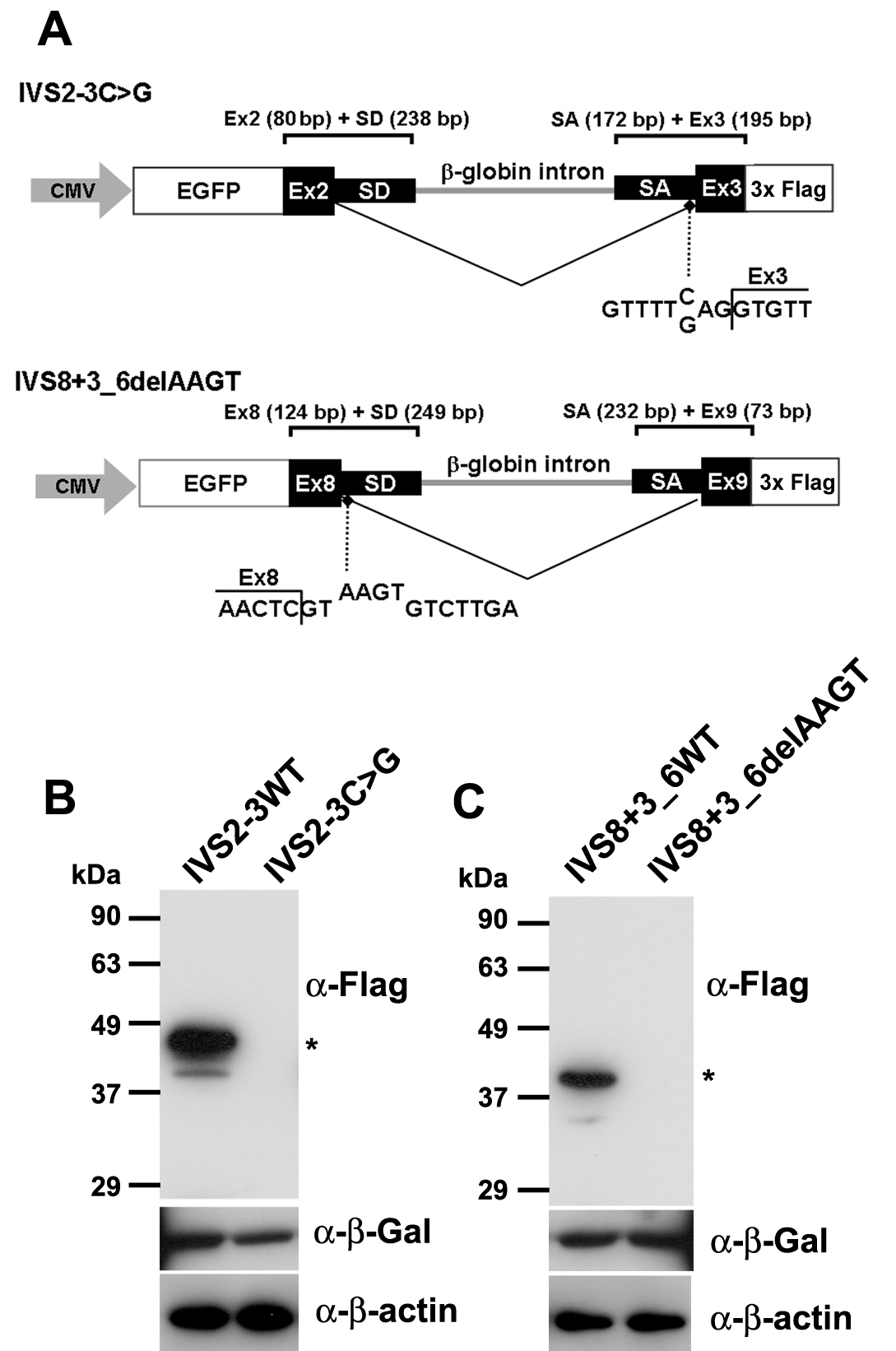 Figure 2. Analysis of protein expression from TRPM1 mutant minigenes. A: Schematic of TRPM1 minigenes. The minigene IVS2–3C>G contains an EGFP gene, exon 2, the exon 2 splice donor region, a portion of the β-globin (HBB) intron 2, the exon 3 splice acceptor region, and exon 3, and uses the CMV promoter and SV40 polyA site from the pEGFP-C3 vector. The minigene IVS8+3_6delAAGT contains an EGFP gene, exon 8, the exon 8 splice donor region, a portion of the HBB intron 2, the exon 9 splice acceptor region, and exon 9, and uses the CMV promoter and SV40 polyA site from the pEGFP-C2 vector. Mutations of IVS2–3C>G and IVS8+3_6delAAGT are shown. B-C: western blots of HEK293 cell extracts transfected with minigenes IVS2–3C>G (B) or IVS8+3_6delAAGT (C). WT represents protein from a wild-type minigene transfection, and asterisks represent spliced EGFP detected by an anti-Flag