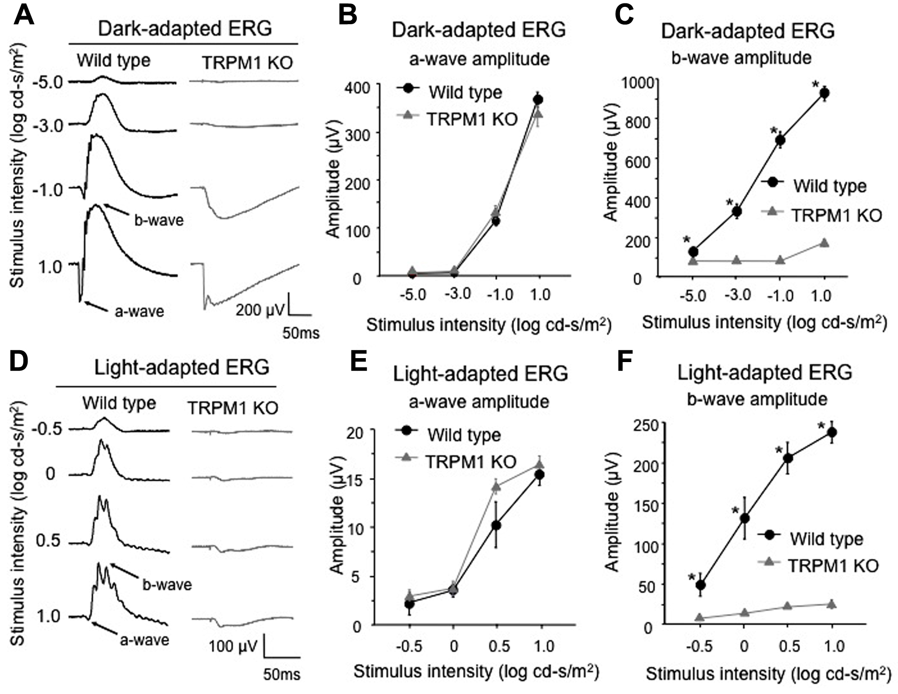 p<0.05). The trpm1–/– mouse had a normal a-wave,