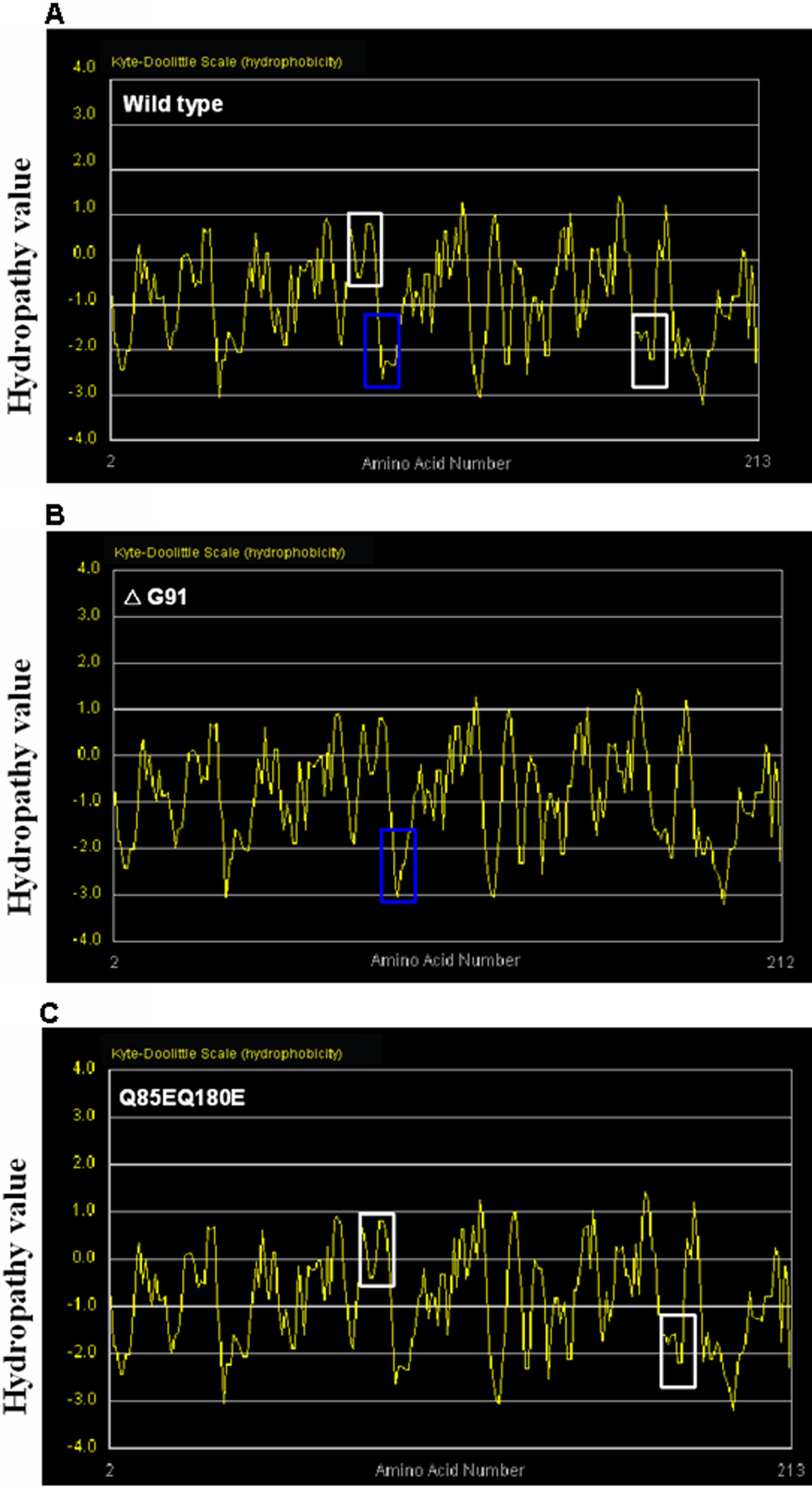 type βA3-crystallin (A), ΔG91 mutant (B), and Q85E/Q180E mutant (C). X-axis represents amino acid position of, and y-axis represents hydropathy value in a window size of 5. The region of interest