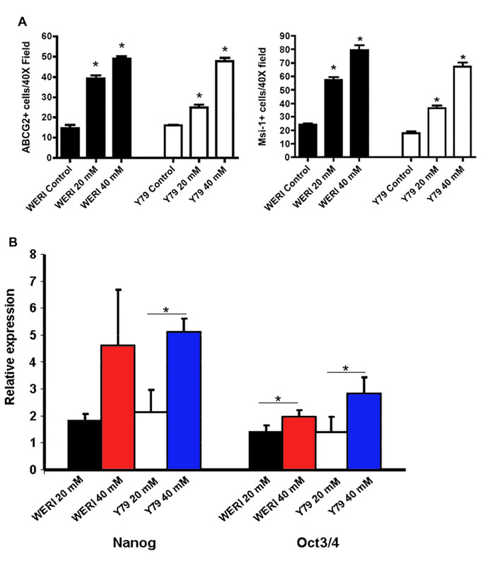 Figure 1. LiCl expands the population of stem-like cells in the Weri and Y79 retinoblastoma cell lines. A: LiCl significantly increased the number of ABCG2 and Musashi-1 (Msi-1) immunoreactive cells. Weri and Y79 human retinoblastoma