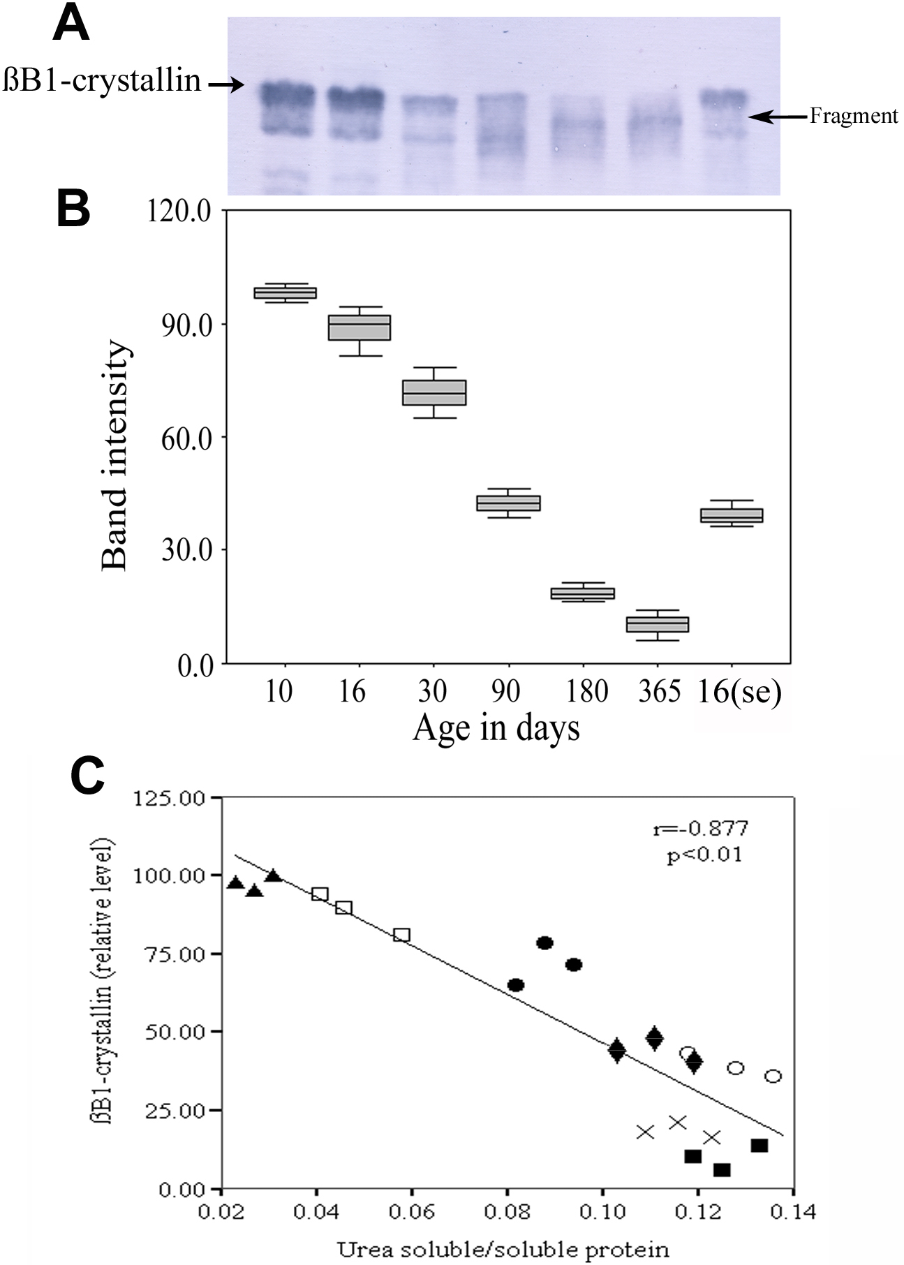 antibody. B: Bnd intensity of β1-crystallin levels relative to 10 day-old rat lenses. C: Linear regression analysis revealed a significant negative correlation between βB1-crystallin and the urea-soluble to soluble