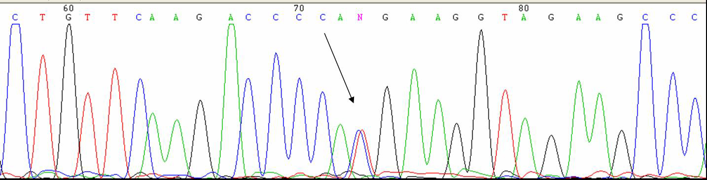 Electropherogram. This image is showing mutation 1482 C>T (Thr494Met) in Precursor mRNA-Processing factor 3 (PRPF3). The arrow showing the “double hill” at position 73, corresponding to heterozygote mutation.