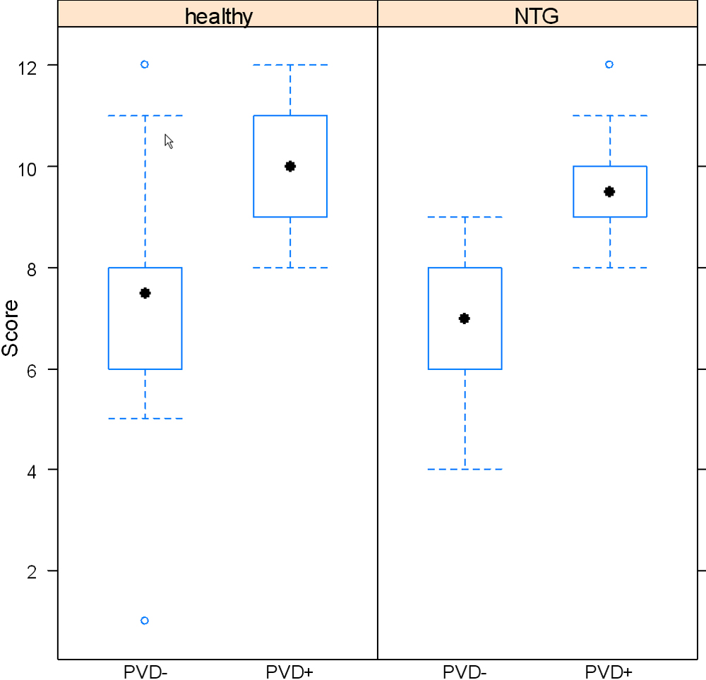 Sniffin’ Sticks score results in healthy and normal tension glaucoma (NTG) subjects. Healthy subjects with a PVD as well as glaucoma patients with a PVD could identify odors better than those without a PVD.