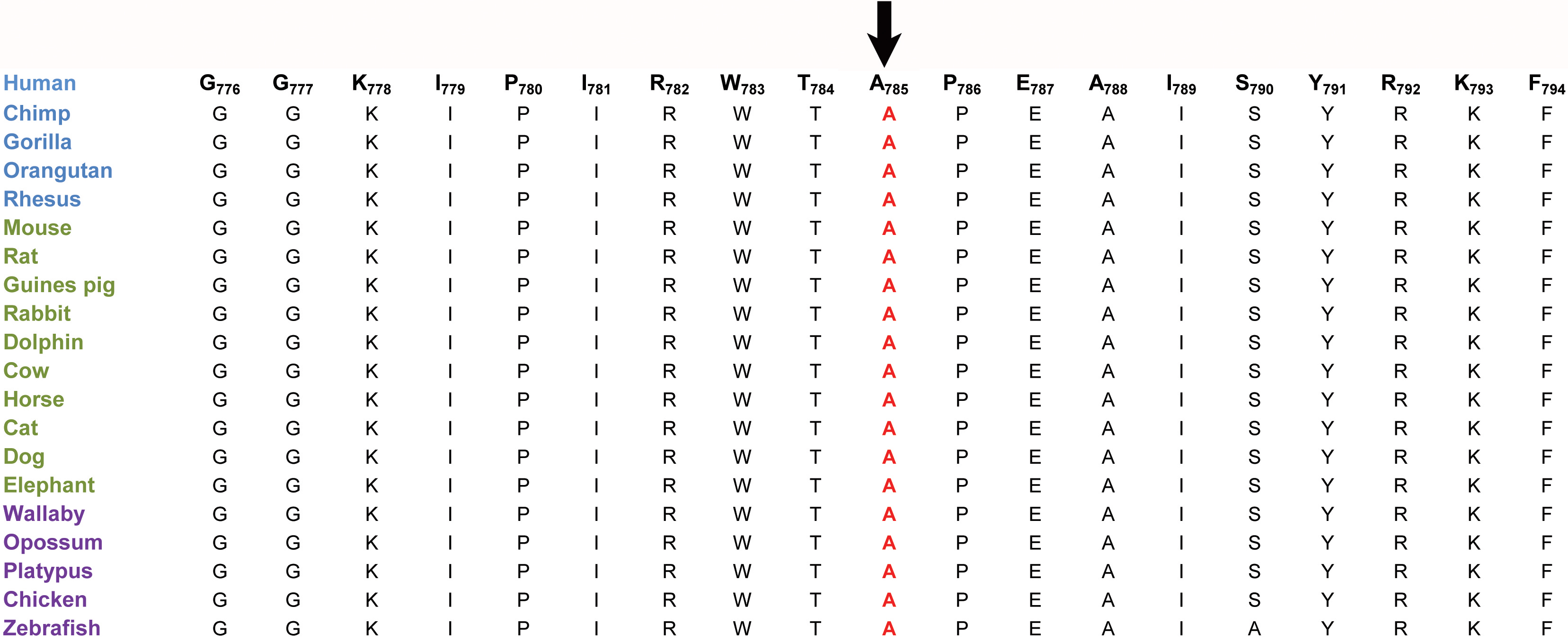 and in purple are vertebrates. The arrow points to A785 that is mutated