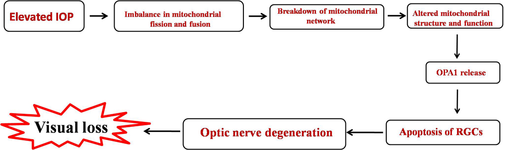 Role of elevated IOP in RGCs death in glaucoma. Abbrevations: RGCs- Retinal ganglion cells; IOP- intra ocular pressure; OPA1-optic nerve atrophy type-I.