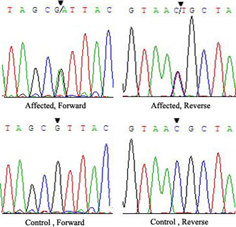 Forward and reverse sequence analysis of the affected and unaffected individuals in this ADCC Chinese family. A heterozygous mutation (c.319G>A) in exon 1 of