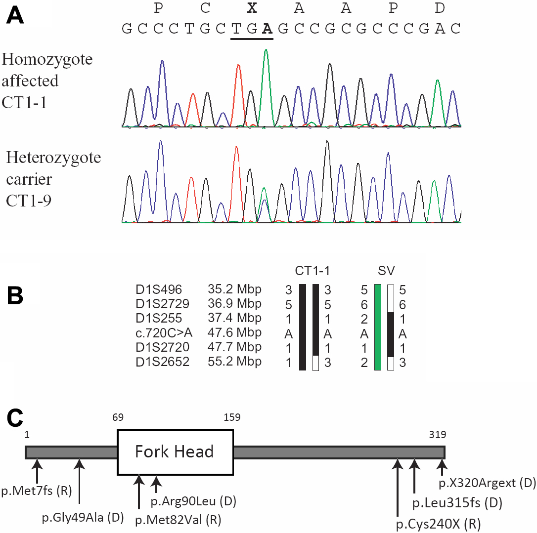 Recessive inherited mutations (R) and dominant mutations (D) are