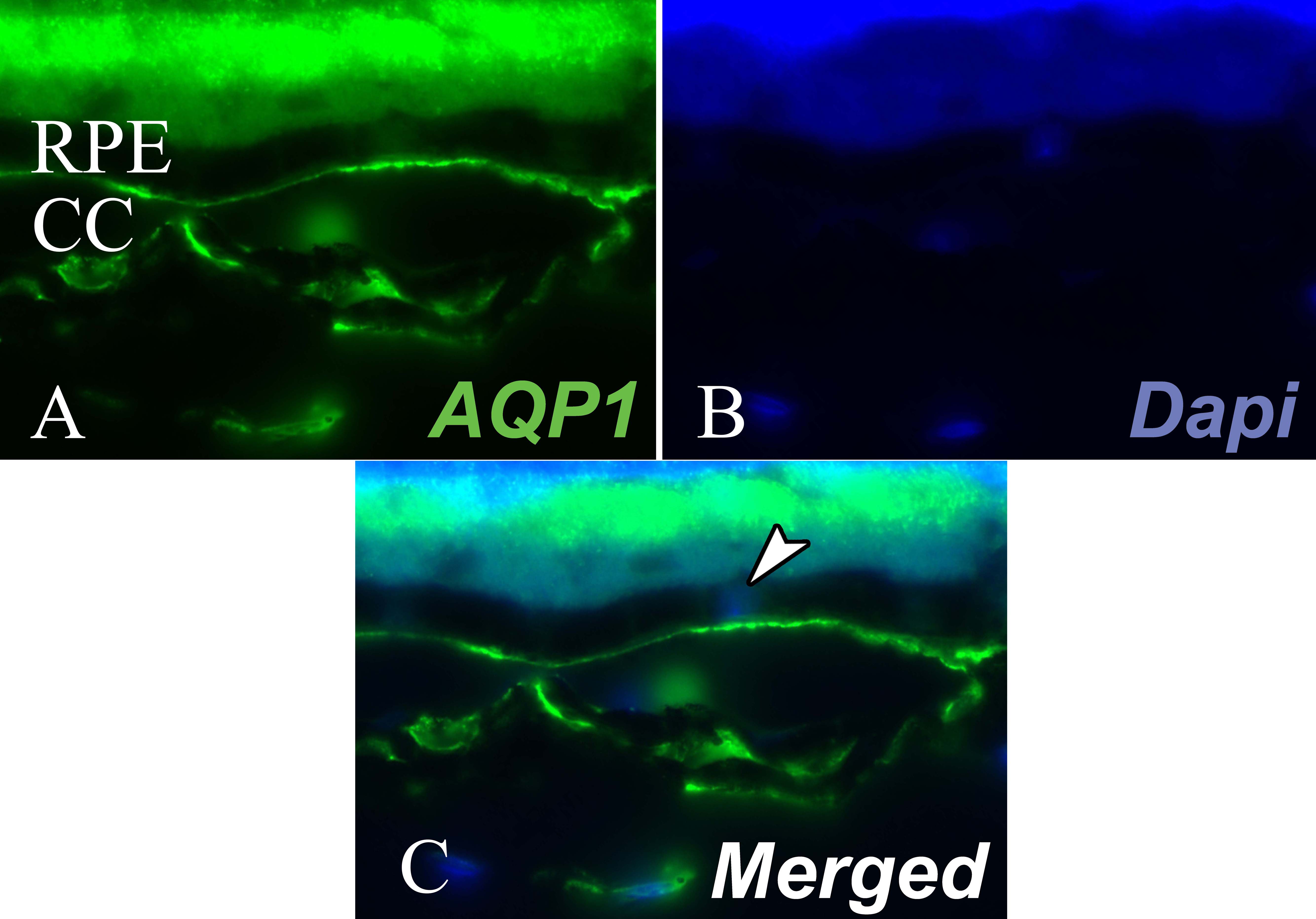 corresponds to merge image. The arrow shows the cell nuclei of the RPE