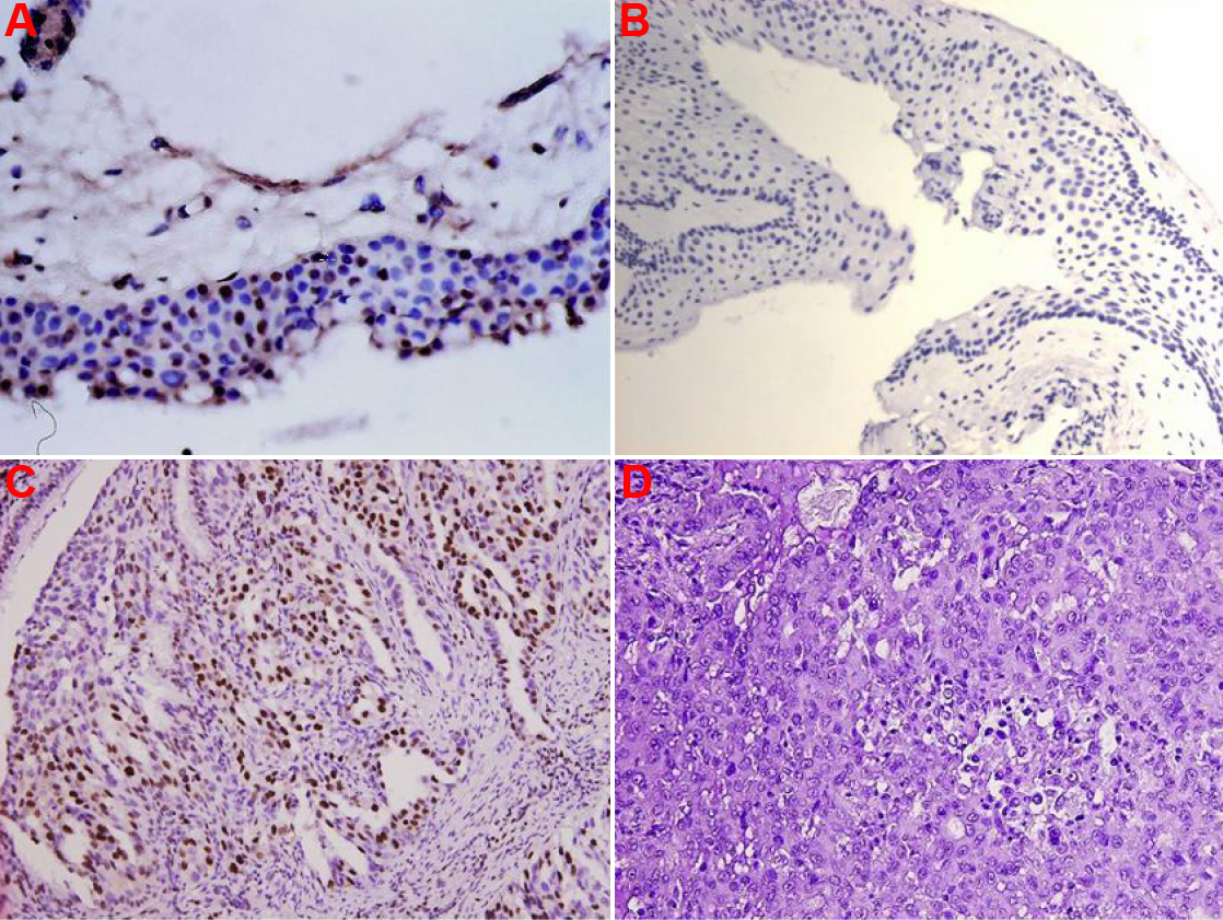 of pterygium epithelial cells. Representative positive immunostaining (brown signal) in the epithelial layer is shown in A (200×), negative immunostaining is shown in B (200×), a lung cancer section with high BPDE-like DNA adduct levels used as the positive control is shown in C (brown; 200×), and a lung cancer section with no detectable BPDE-like DNA adduct levels, which was used as the negative control,