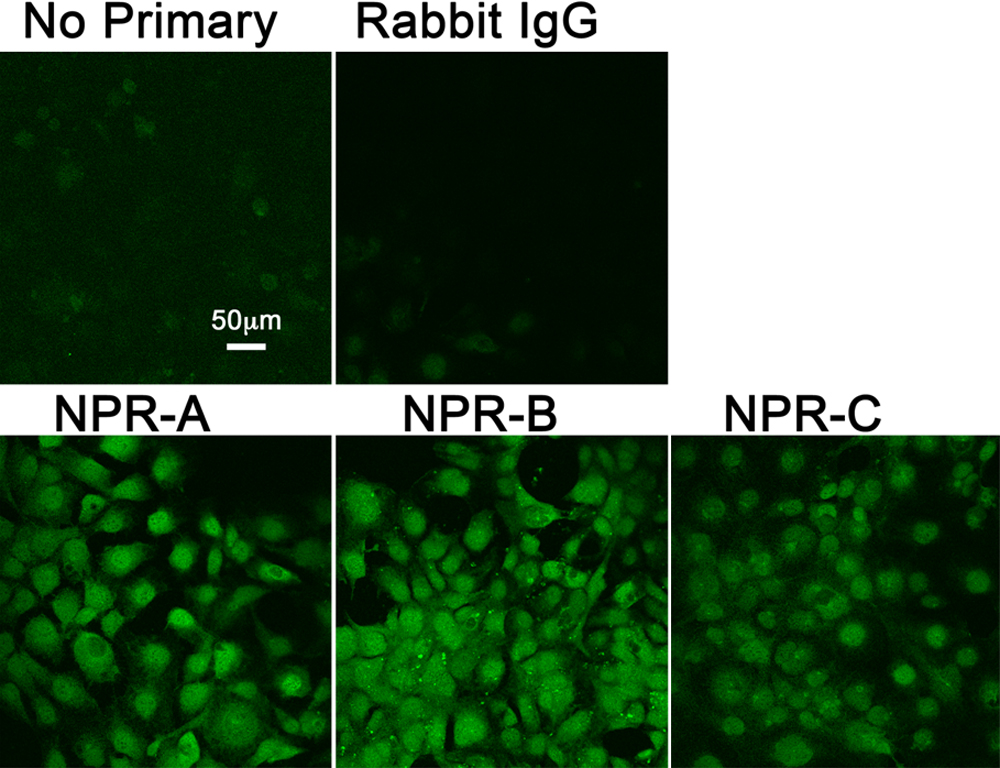 Figure 2. Immunoflourescent analysis of natriuretic peptide receptor expression in HLE-B3 cells. Immunoflourescence and confocal microscopy