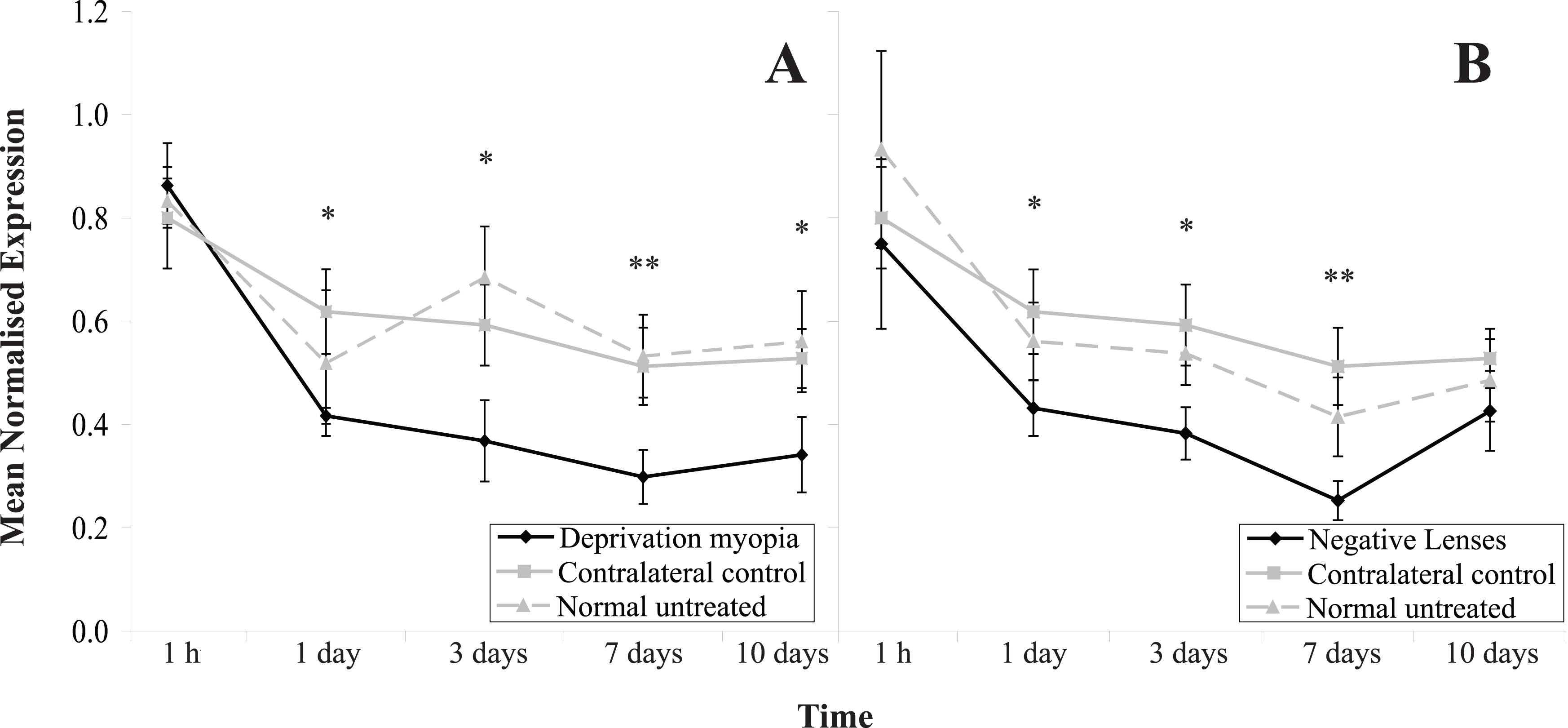 negative-lens treated (B) eyes following 1 h, 1, 3, 7, and 10