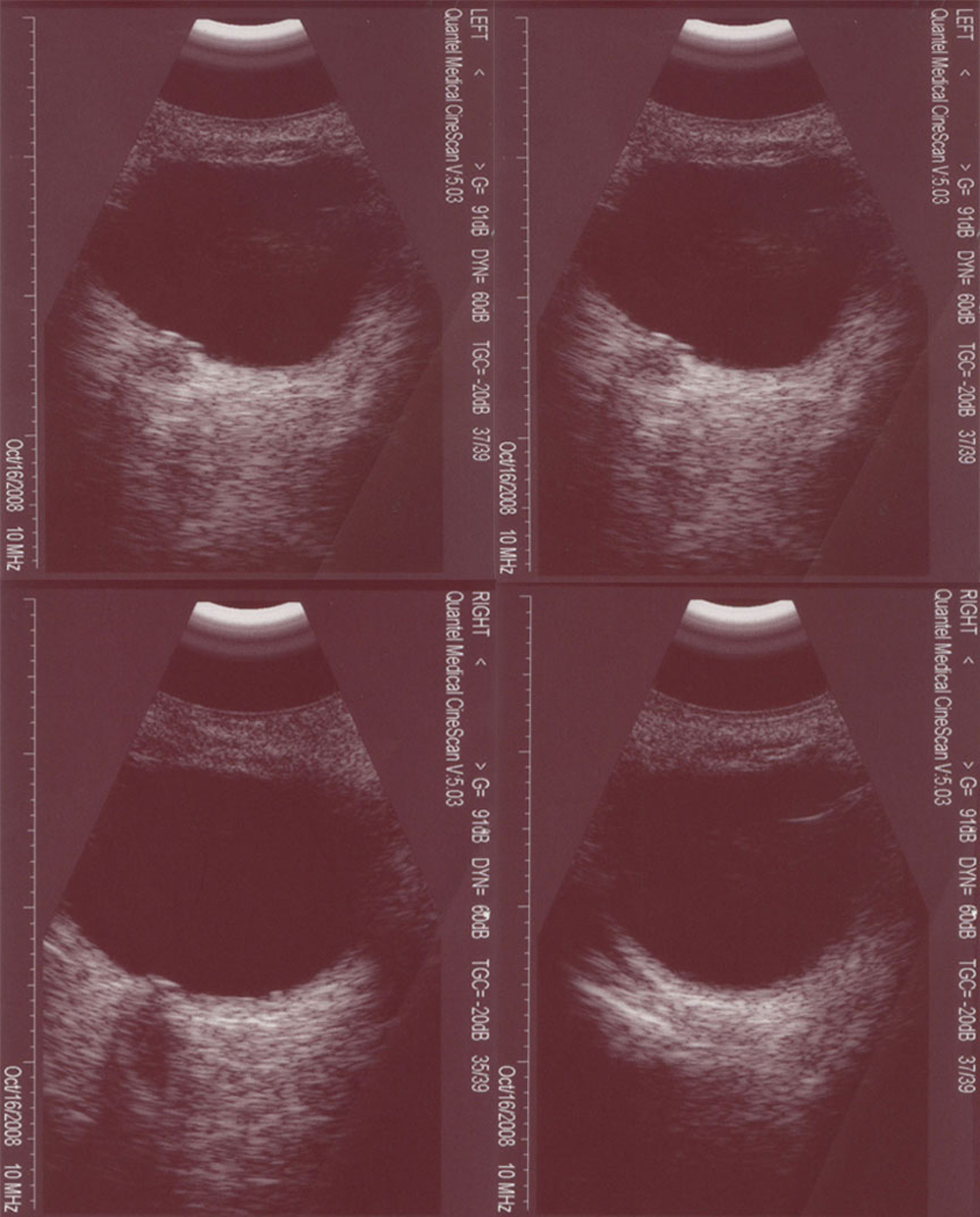 Ocular manifestations of B-scanning. B-scanning revealed the abnormal structure of the vitreous body and optic nerve.