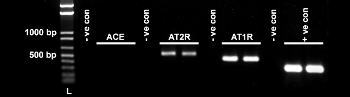 for ACE was detected. -ve con denotes negative controls that contained ACE, AT1, or AT2 primers but water instead of cDNA. + ve con represents the positive control of β-actin (ACTB; 350 bp). L denotes 1 kb plus the DNA ladder.