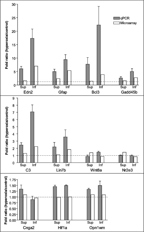 gene, the change was estimated in both the superior and inferior retina by microarray analysis and qPCR. The results of qPCR