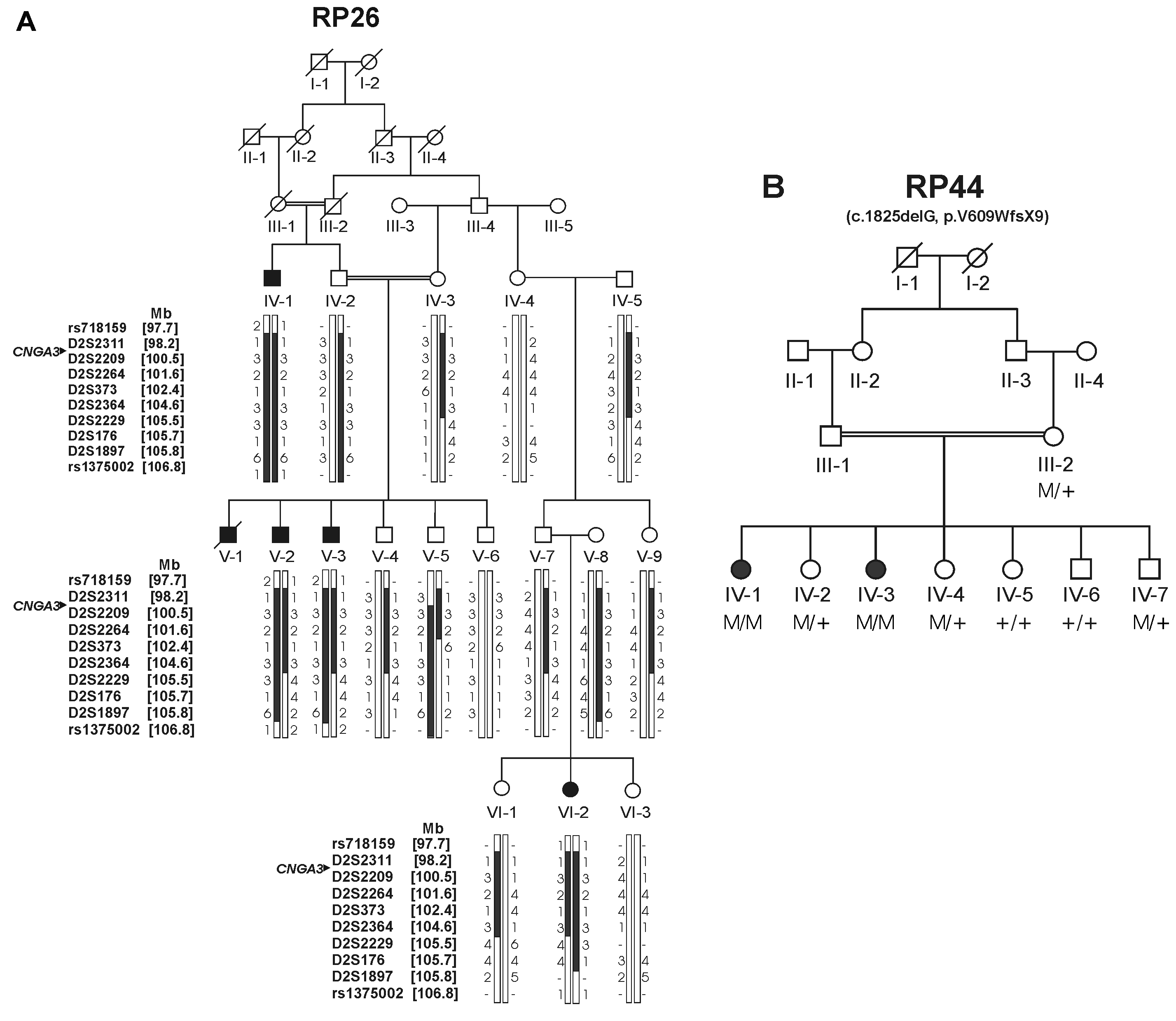 arrowhead). B: Family RP44 and segregation of the c.1825delG