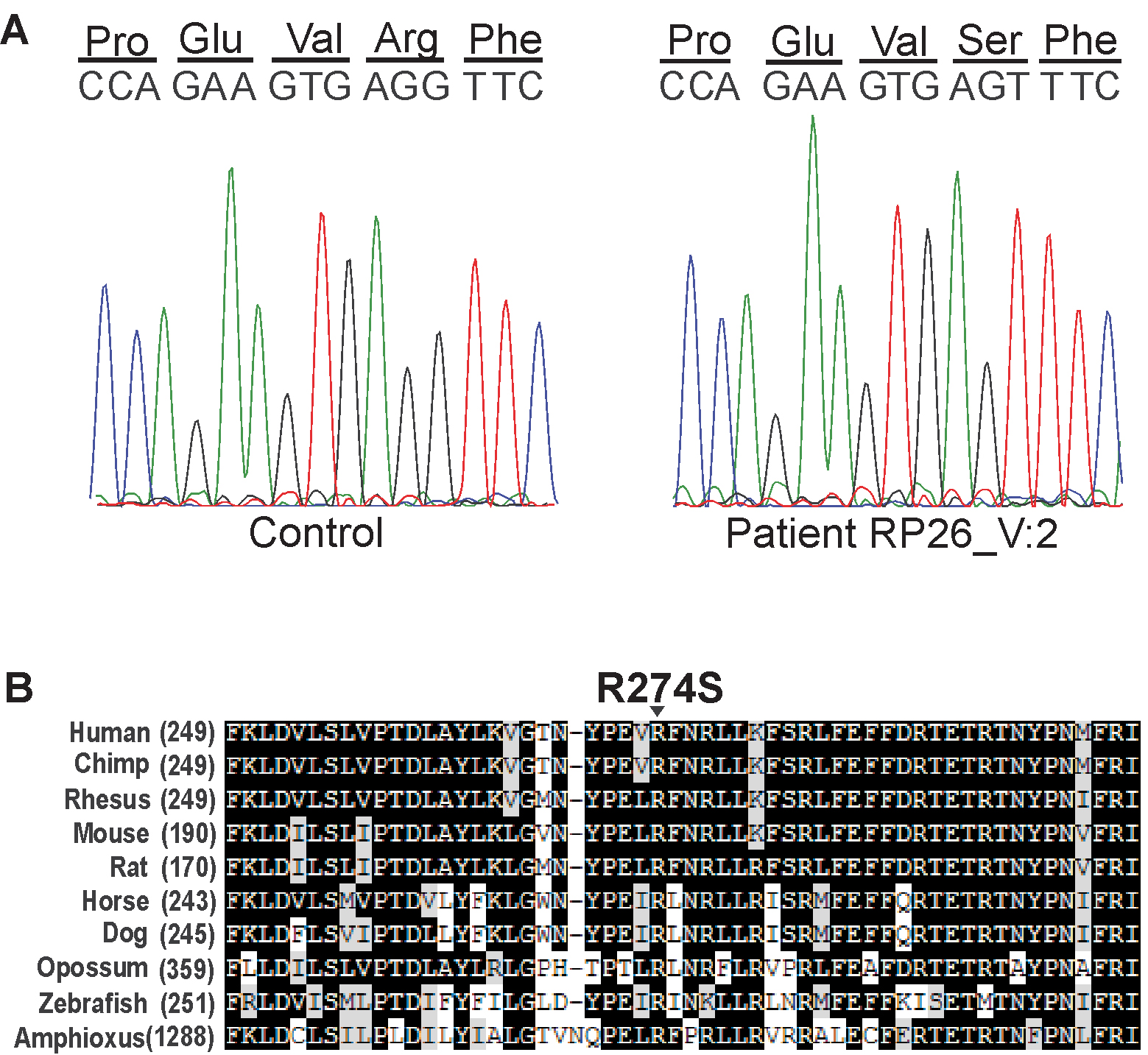 homozygous mutant sequence c.822G>T (p.R274S). B: Protein