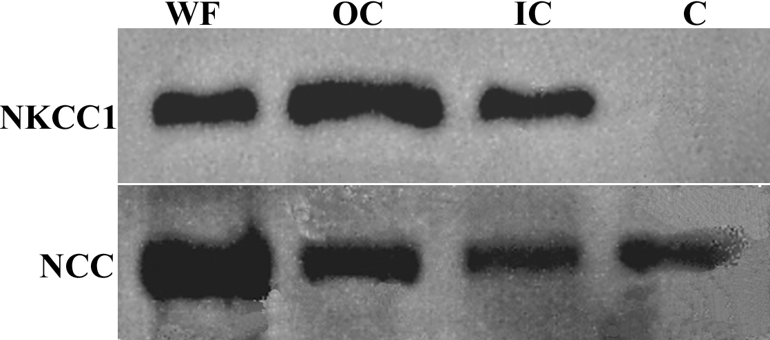 Figure 3. Regional expression of NKCC1 and NCC. Western blots of equal loading of crude membrane preparations from the whole lens (WF)