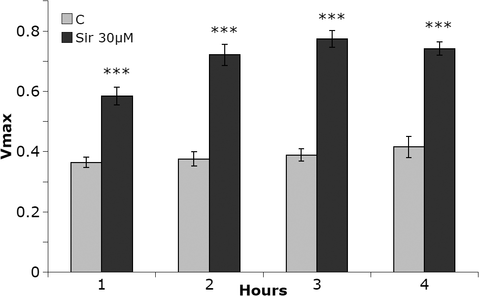 after incubating the cells with 30 µM siramesine for 1–4 h. The figure shows the average of n=3. Mean±SEM is shown. p<0.001