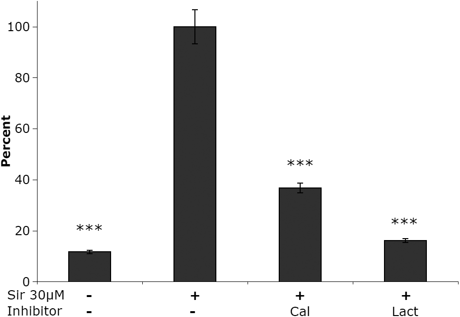 µM siramesine (100 percent on the y-axis) after addition of calpeptin (Cal) or lactacystin (Lact). Proteolysis was measured