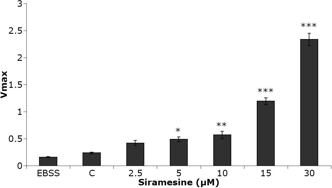 after addition of siramesine 1 h before substrate addition. Vmax is shown with mean±SEM where n=8 and significance levels p<0.05 (*), p<0.01 (**) and p<0.001 (***). Three independent experiments