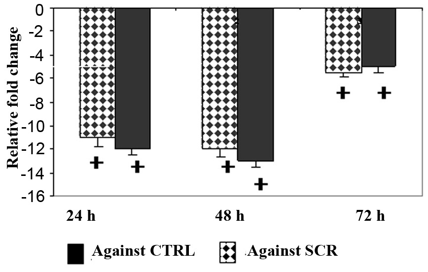 interfering (si)RNA was decreased by 11-fold (p<0.001), 12-fold (p<0.001) and 5.5 fold (p<0.01) at 24, 48, and 72 h respectively