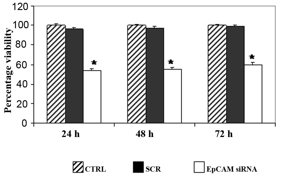 Figure 5. epithelial cell adhesion molecule short interfering RNA treatment decreases the cell proliferation of Y79 cells. The Y79 cells