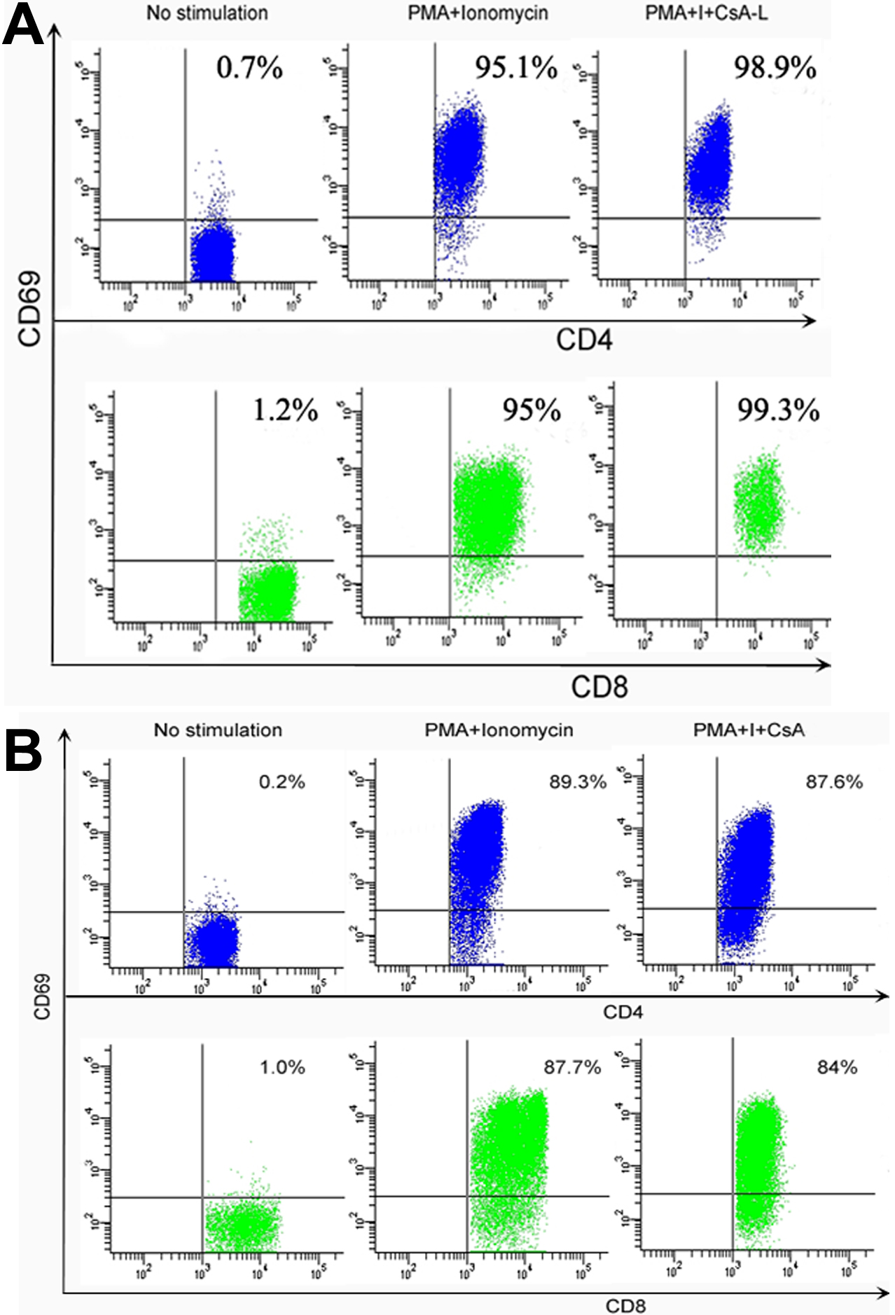 of CsA (50 ng/ml). Cells were analyzed using FACS. The expression of CD69 by CD4+ and CD8+ T cells from (A) normal controls and (B) BD patients was not inhibited by CsA (50 ng/ml). Data are shown representative of five independent experiments.