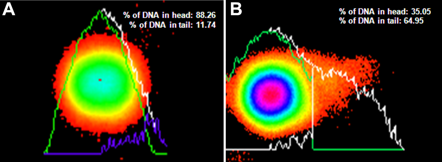 DNA damage quantification by software in the head and tail of a comet in LEC.